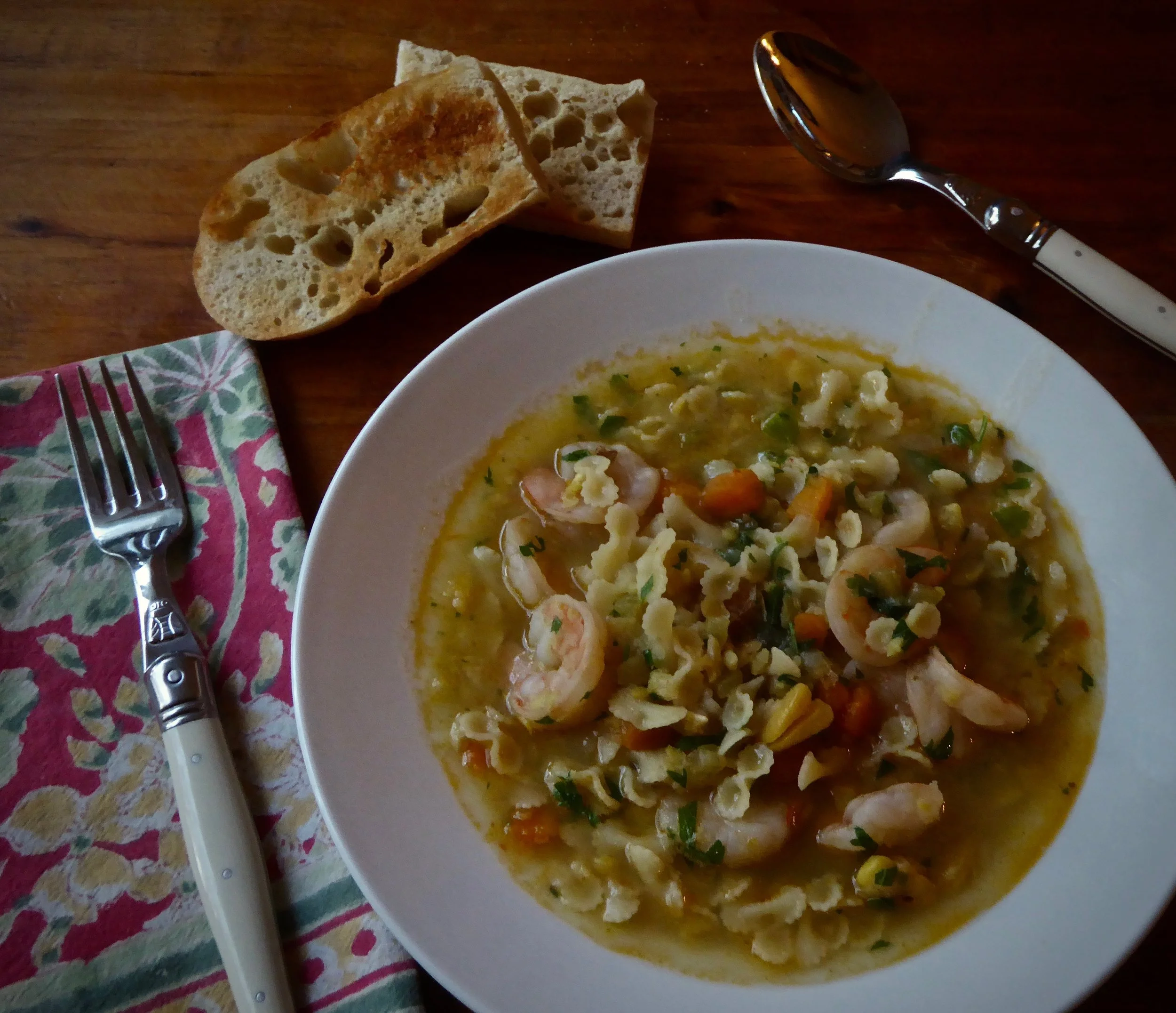 Fava Beans and Mini Bowties with Shrimp in Broth.