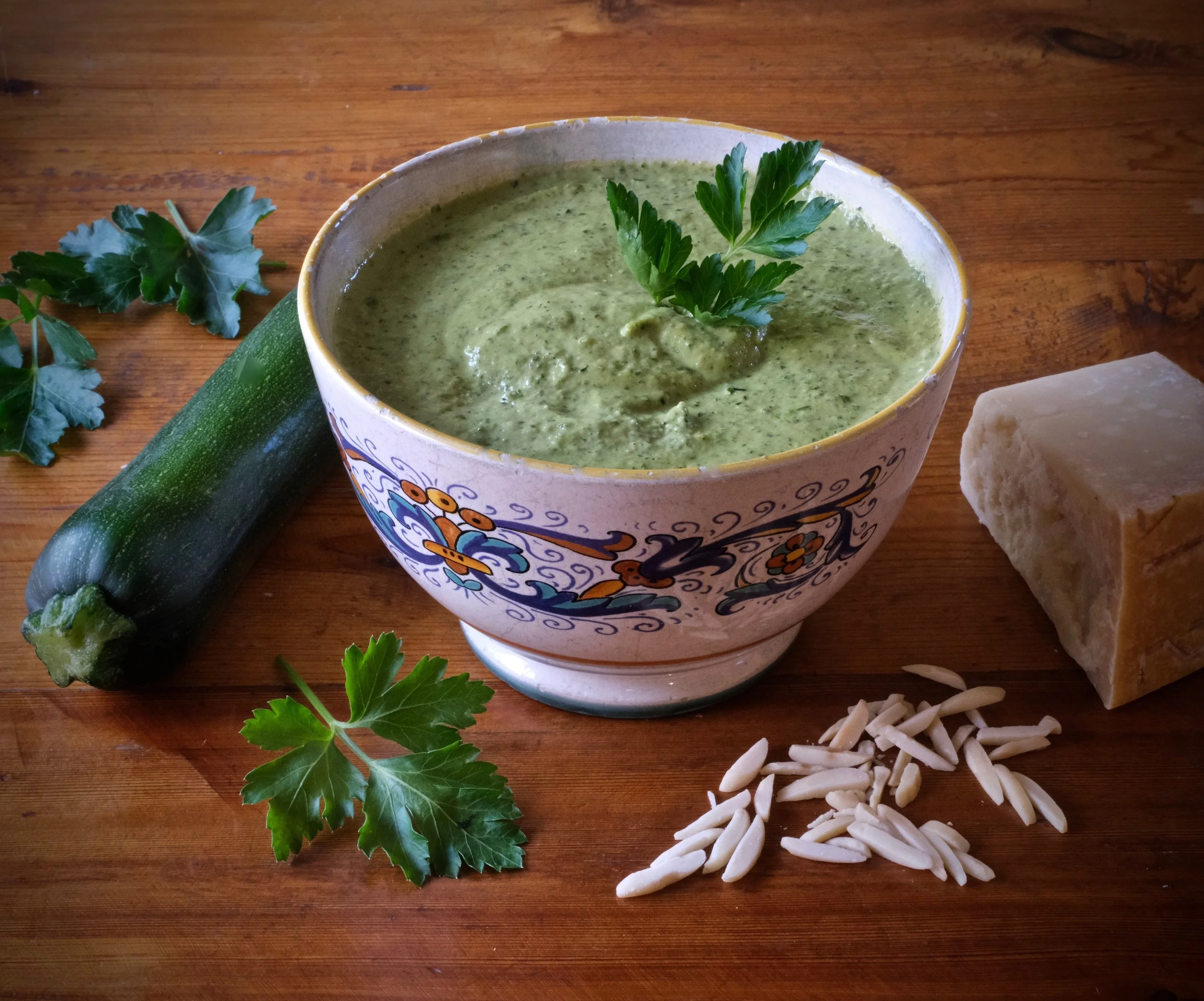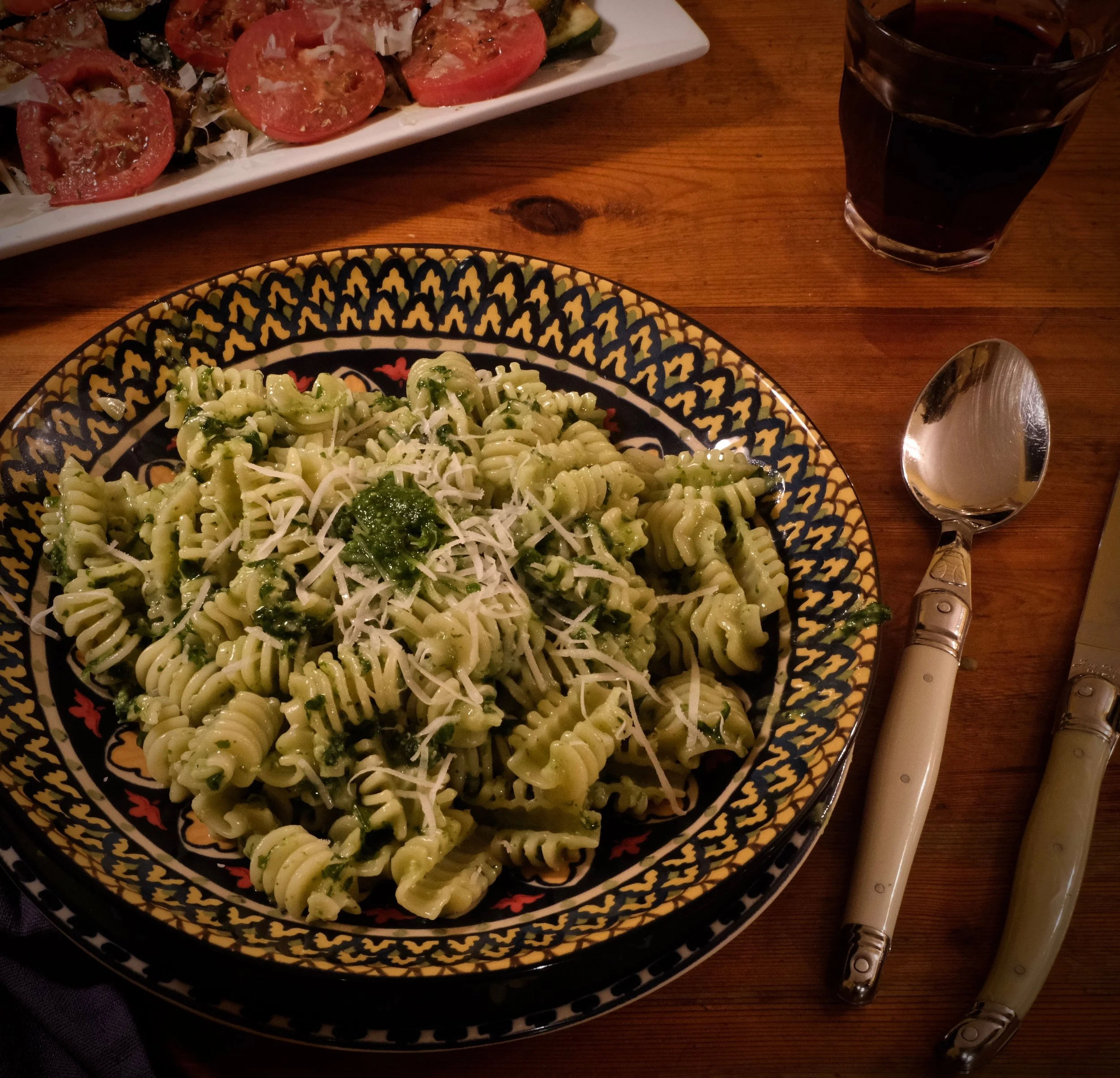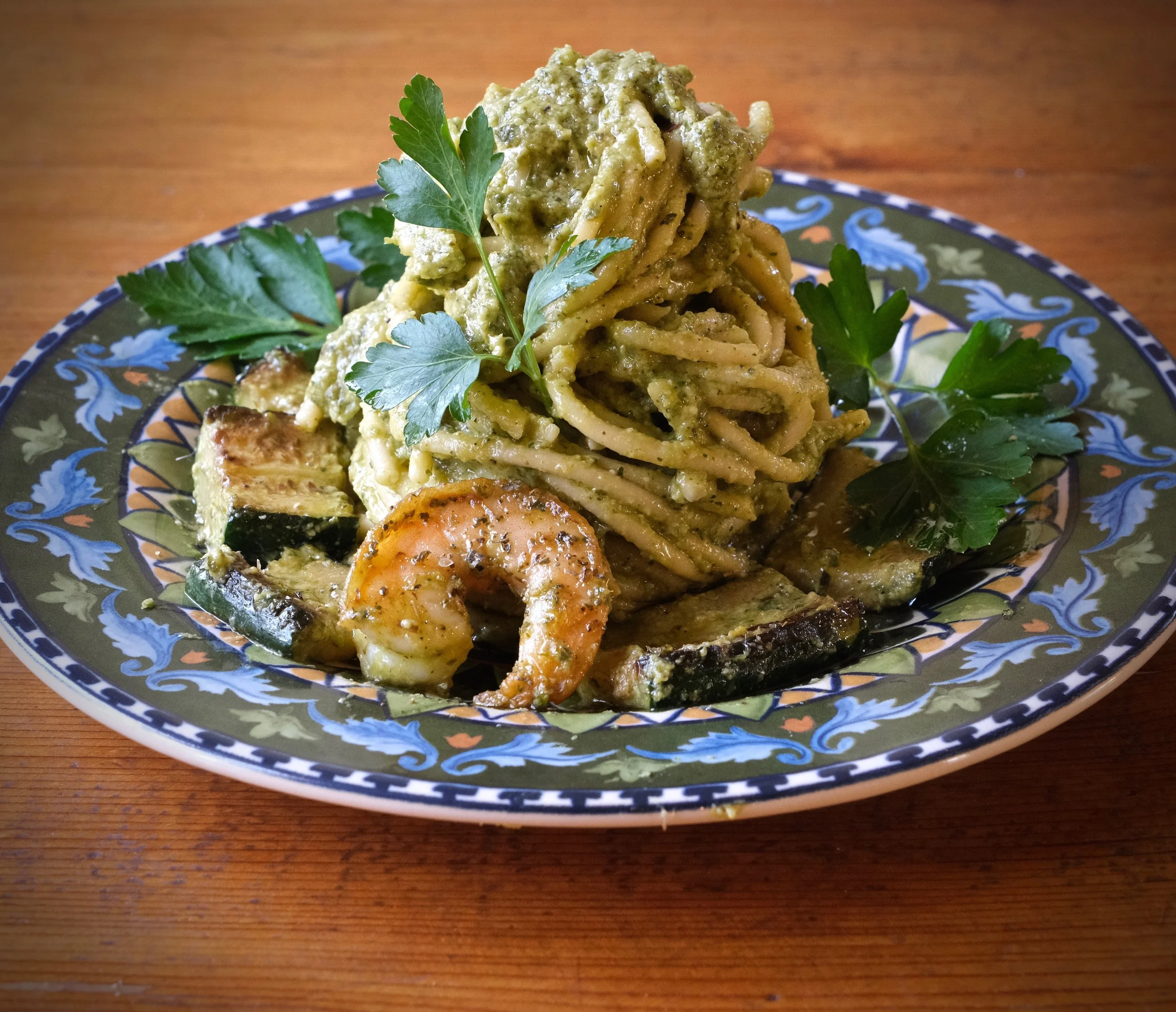 Spaghettoni with Roasted Zucchine Pesto and Grilled Shrimp / Spaghettoni con Pesto di Zucchine Arrostite e un contorno di Gamberi Grigliati).