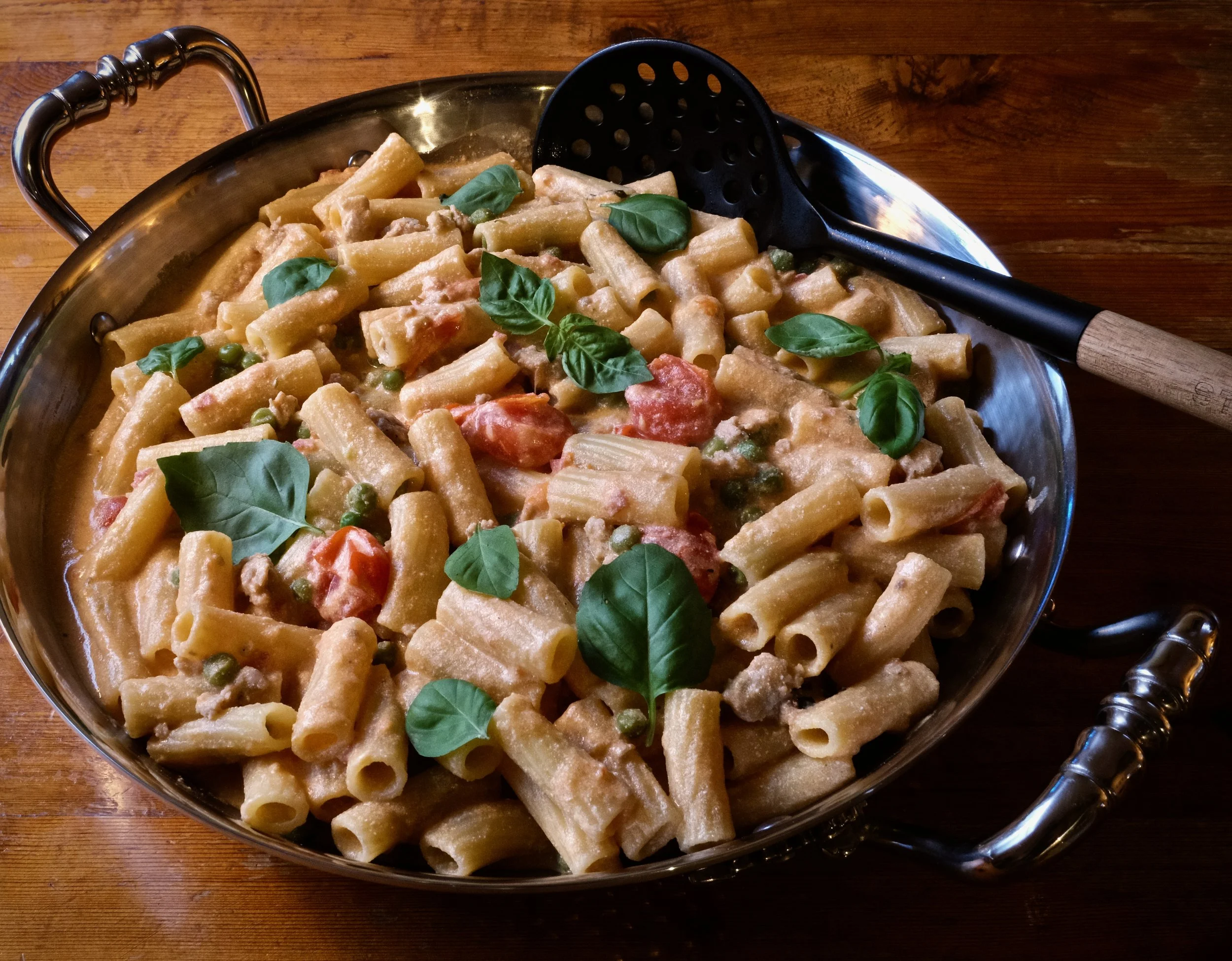 Rigatoni con Ricotta, Pomodorini Budellati, Piselli e Salsiccia /