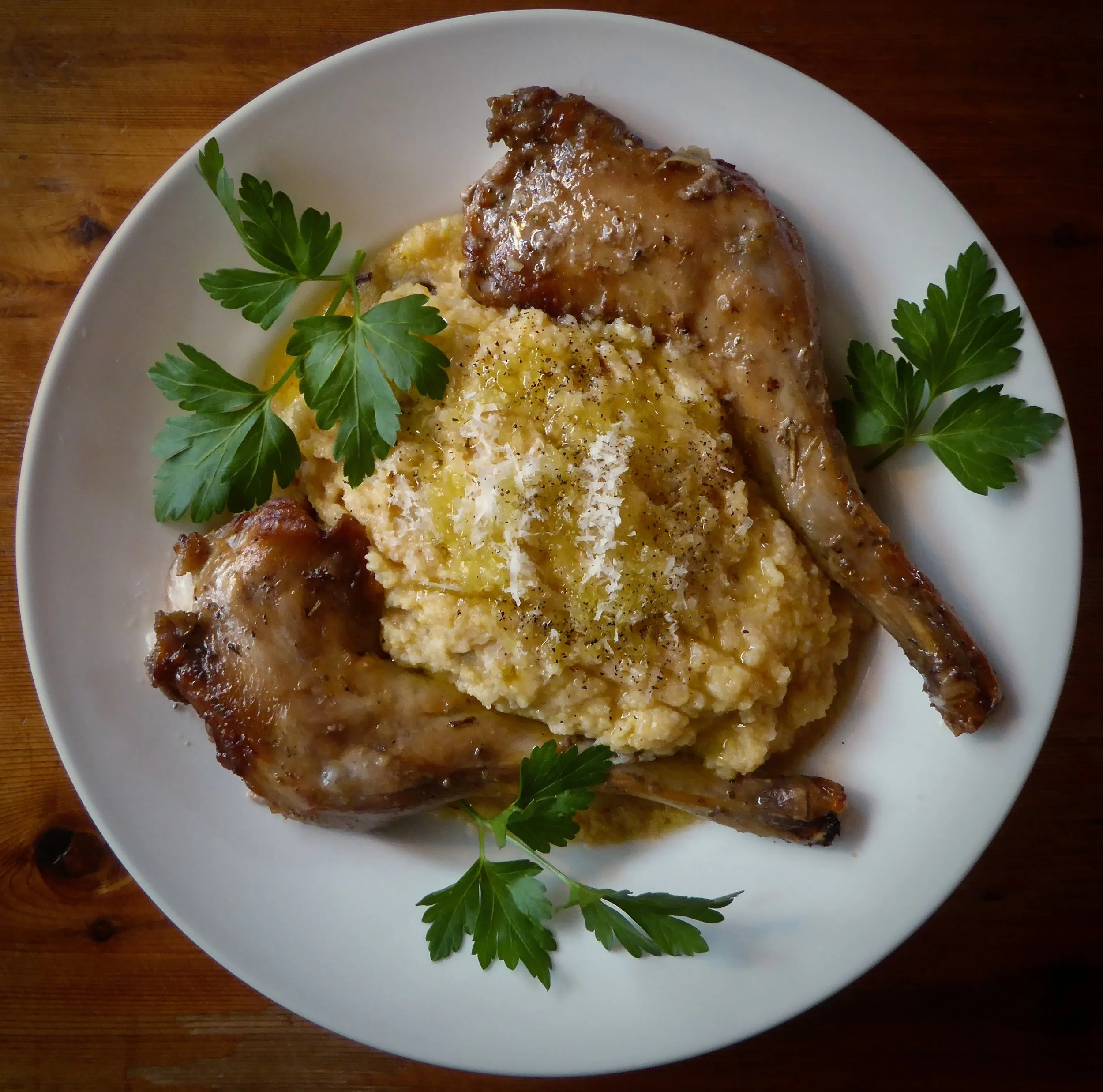 Alette di Pollo e Fave Brasate al Pomodoro su Polenta Morbida.