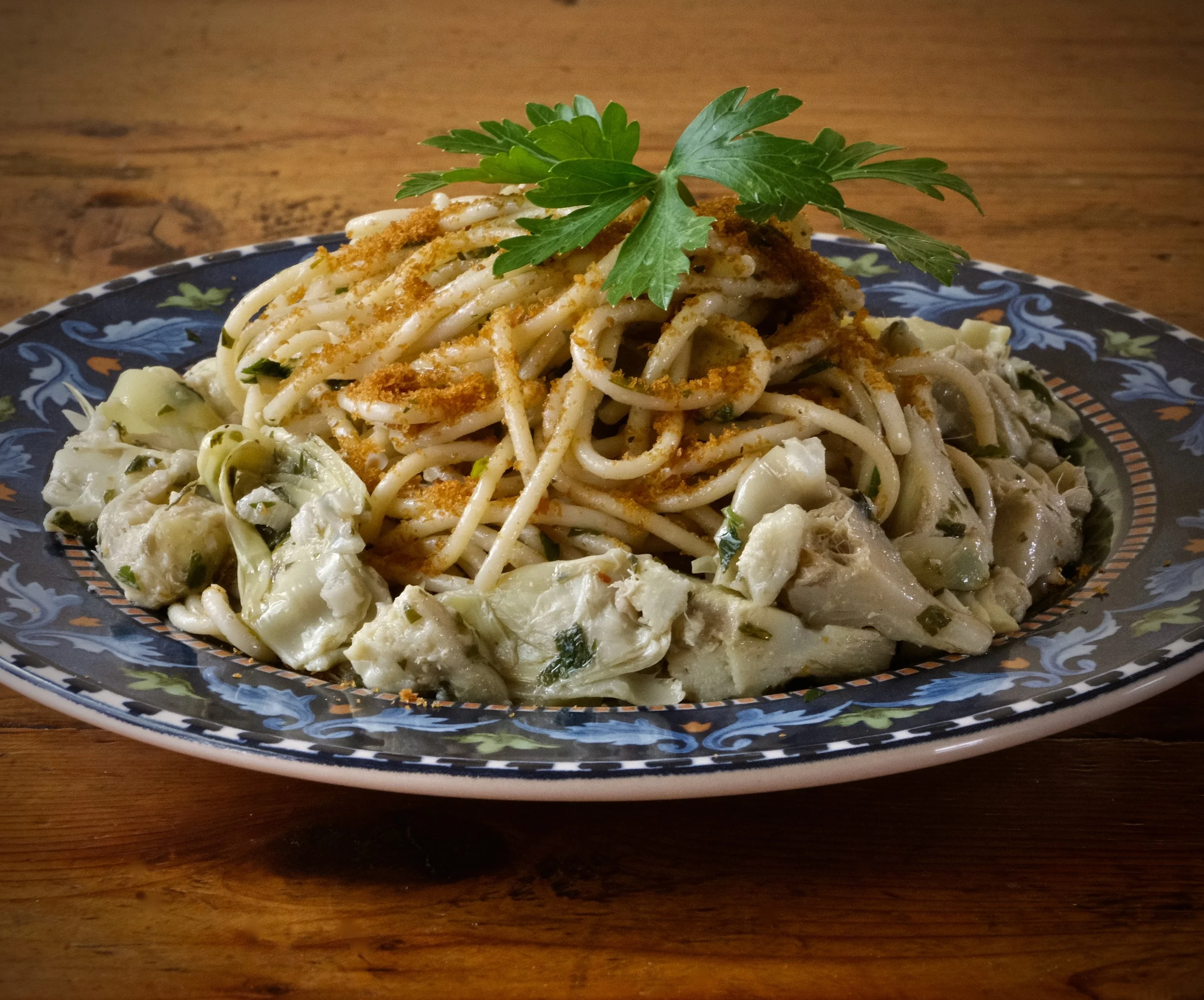 Spaghetti with Bay Scallops, Hearts of Baby Artichoke and Botarga /
