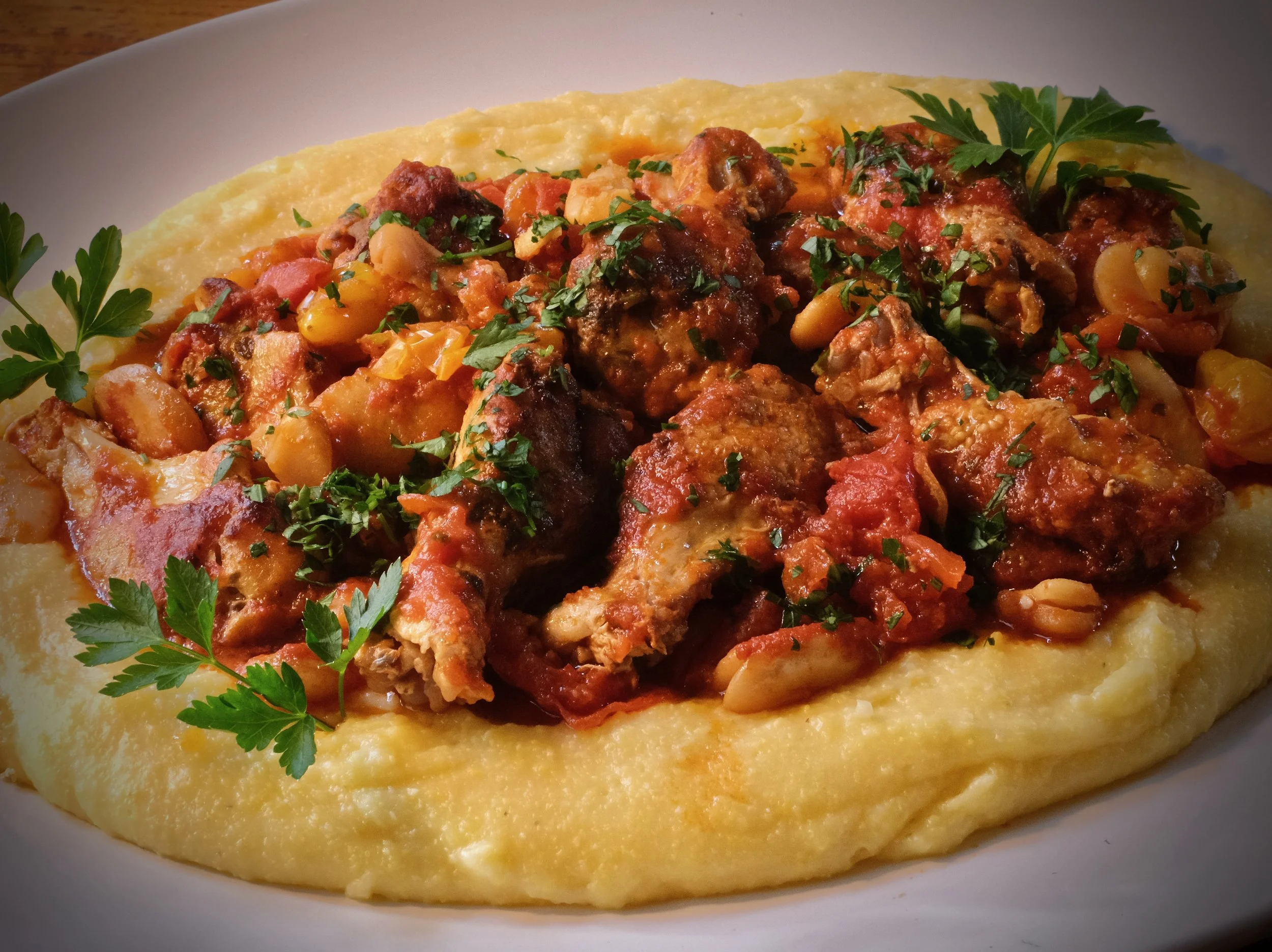 Chicken Drumettes and Fava Beans braised with Tomato on Soft Polenta /