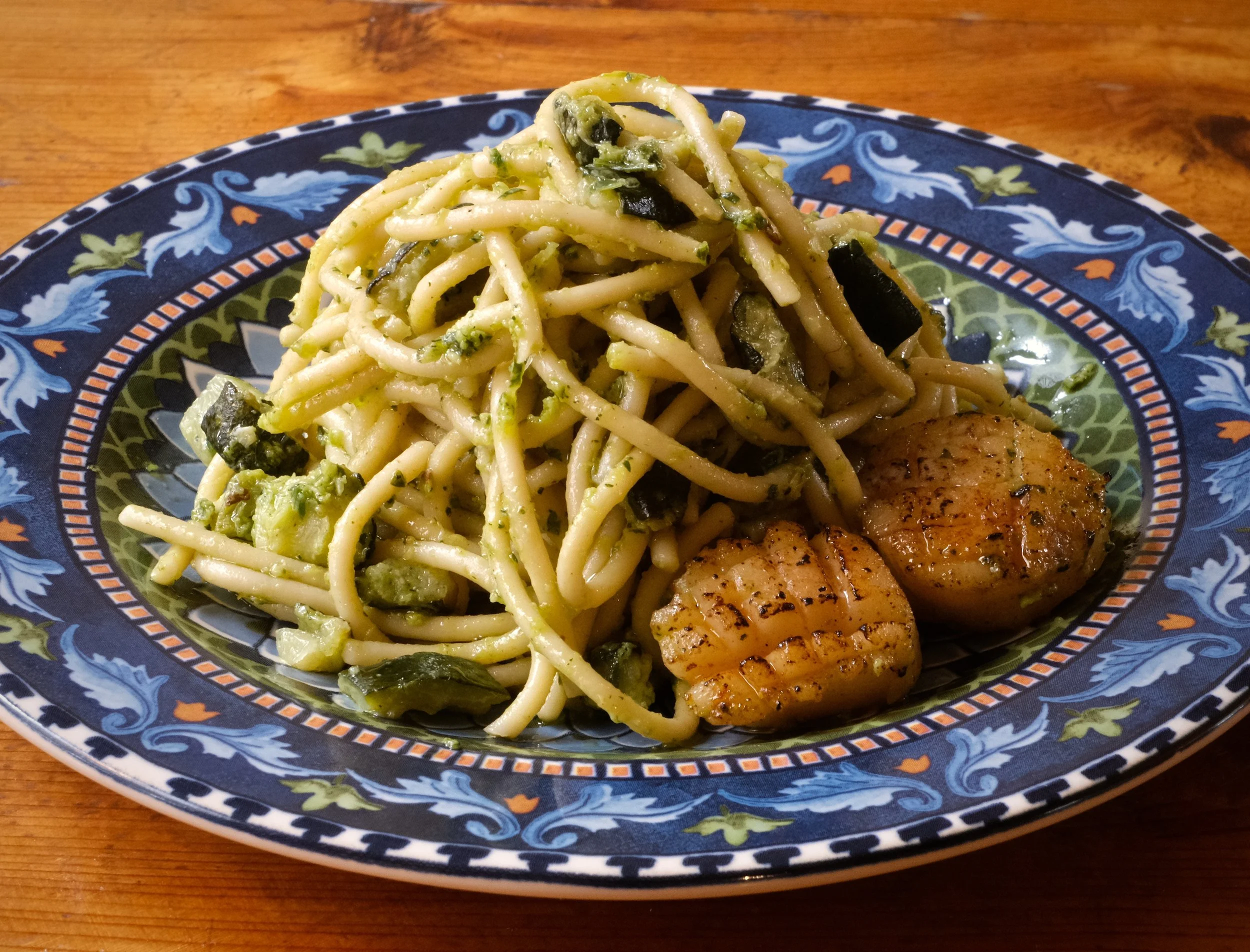 Thick Spaghetti with Zucchini Pesto and Grilled Scallops.